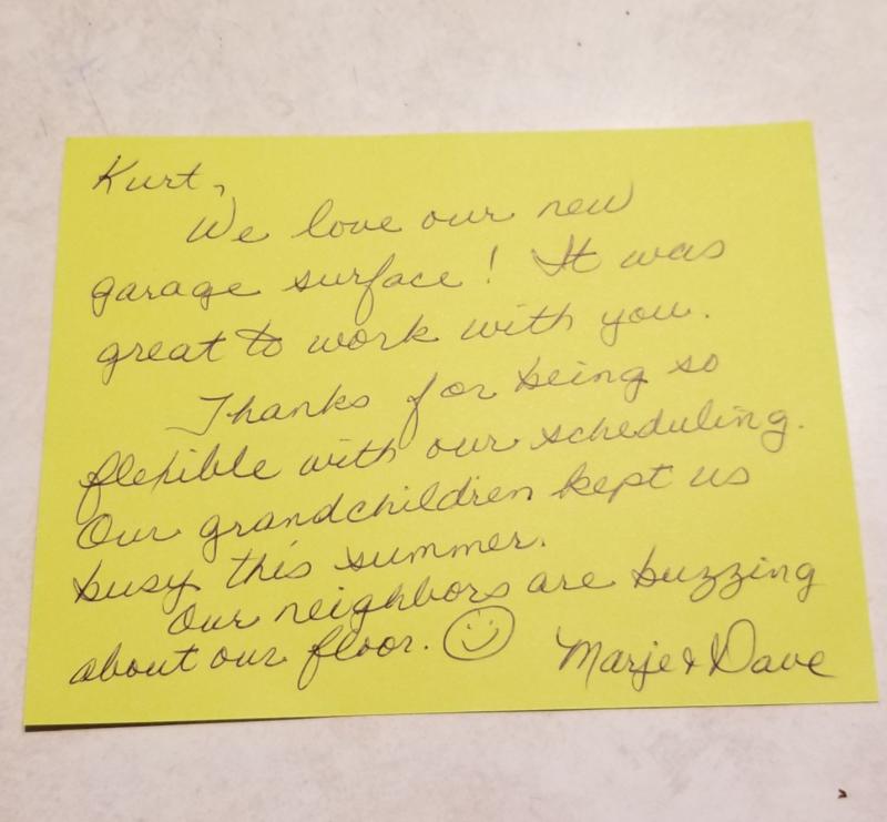 I love our "new" garage floor!! Thanks for being professional and receptive to our concerns. I will gladly recommend you to our friends. Kurt, thanks for being so nice, (+ Michele too!)